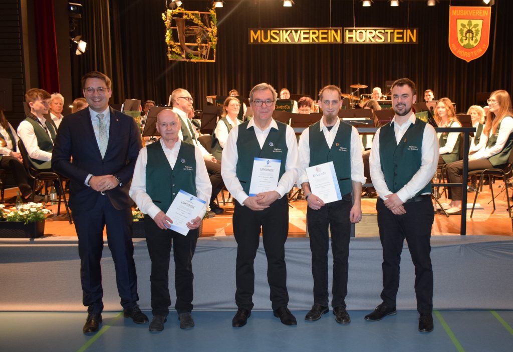 Verdiente Ehrung für insgesamt 135 Jahre aktives Musizieren: Jürgen Weidinger (2.v.l.), Burkhard Nimbler (Mitte), Tommy Telkemeier (2.v.r.)