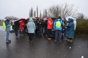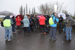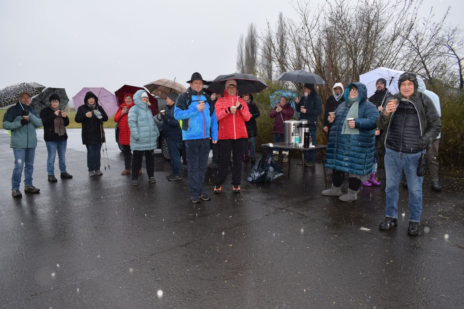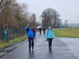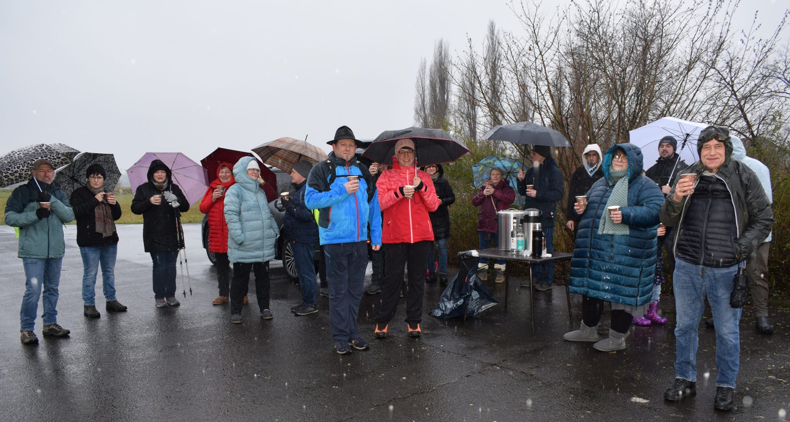 Die Rahmenbedingungen gestalteten sich etwas anders als im letzten Jahr. Anstelle von Sonnenschein marschierten wir im Regen und es war auch kein Schnee weit und breit zu sehen, dafür feuchte Wälder und Felder. Unserer Wanderslust tat dies keinen Abbruch, mit entsprechender Kleidung und Schirmen nahmen wir unser Zwischenziel in Angriff.