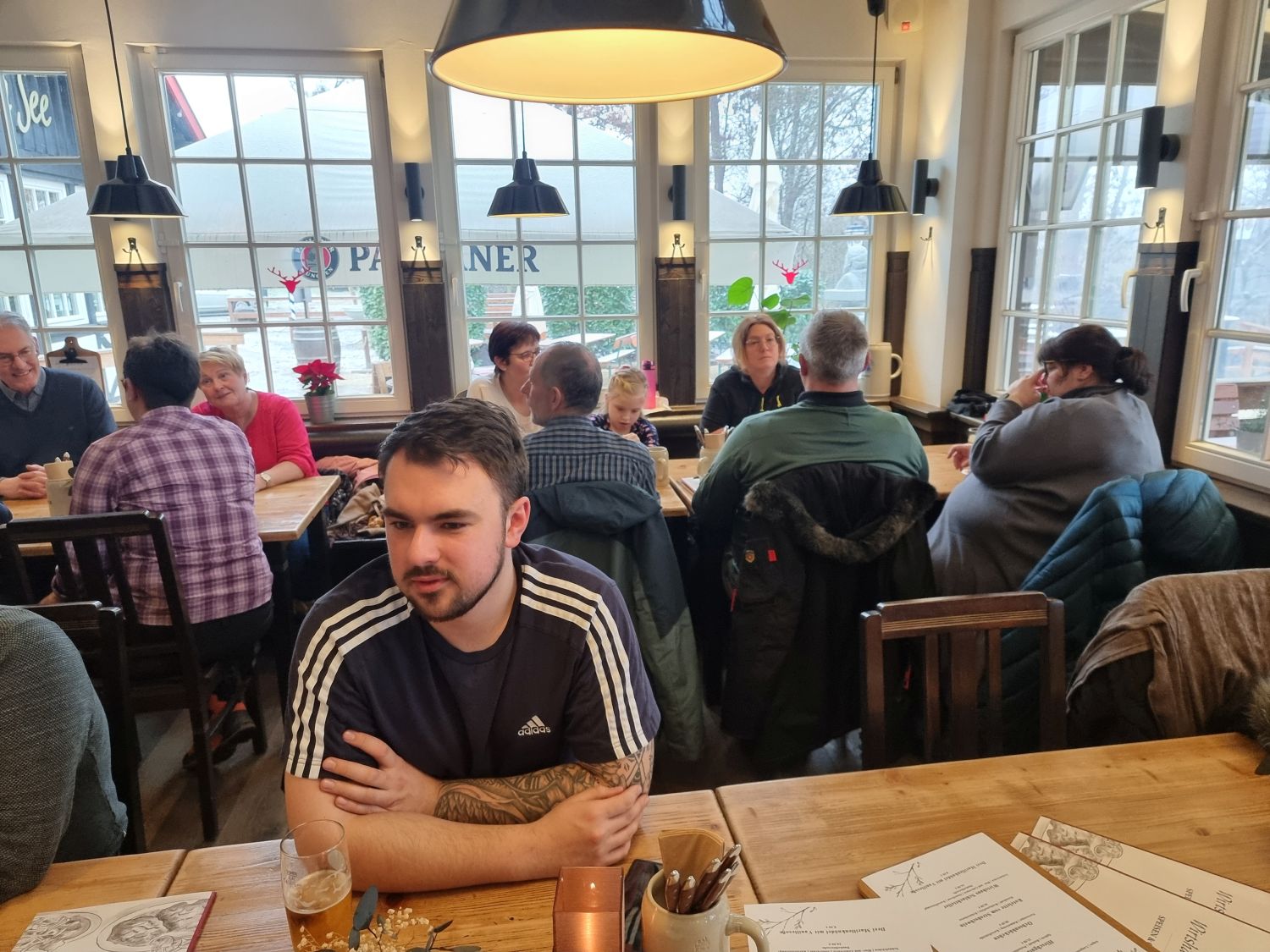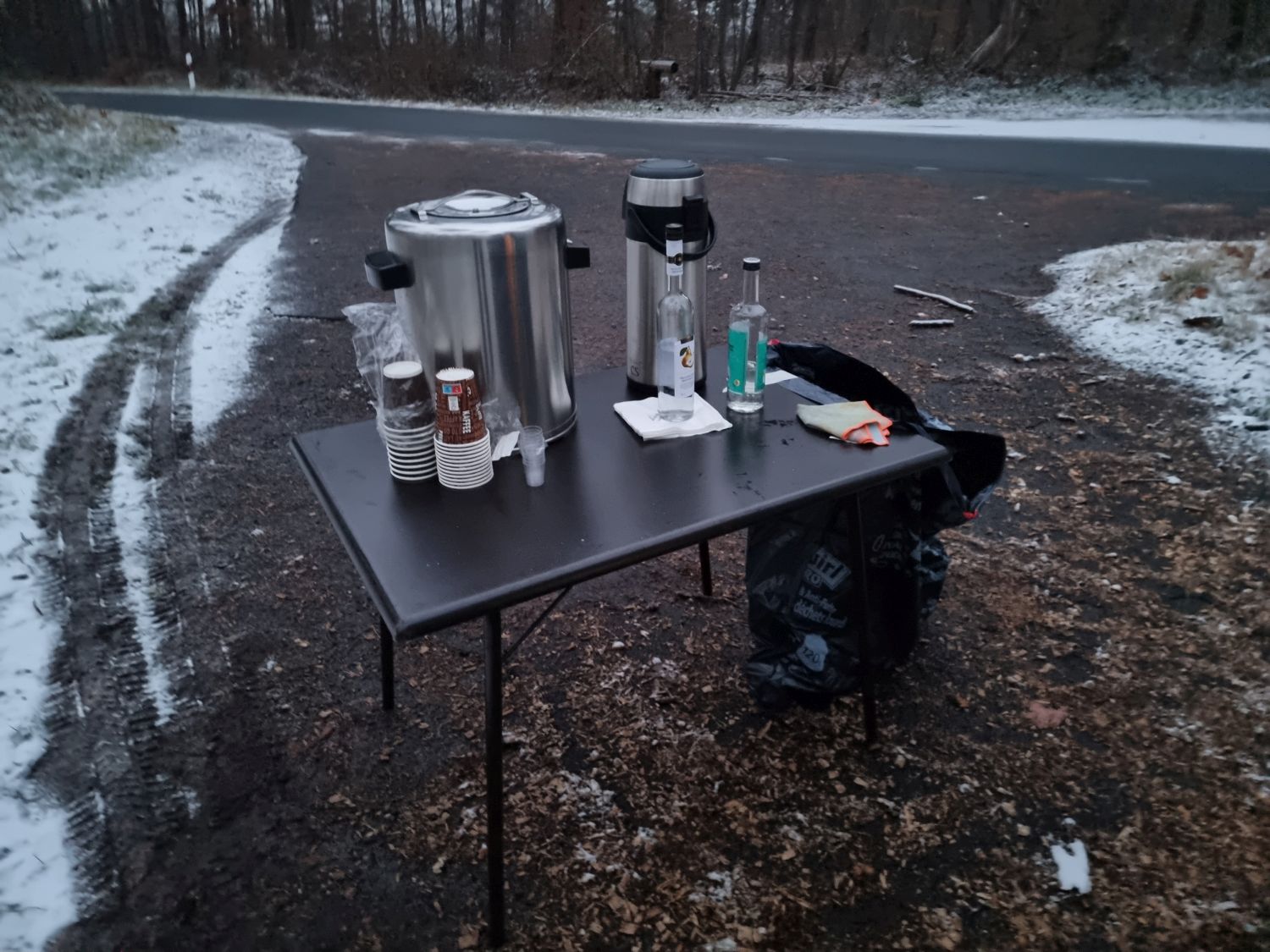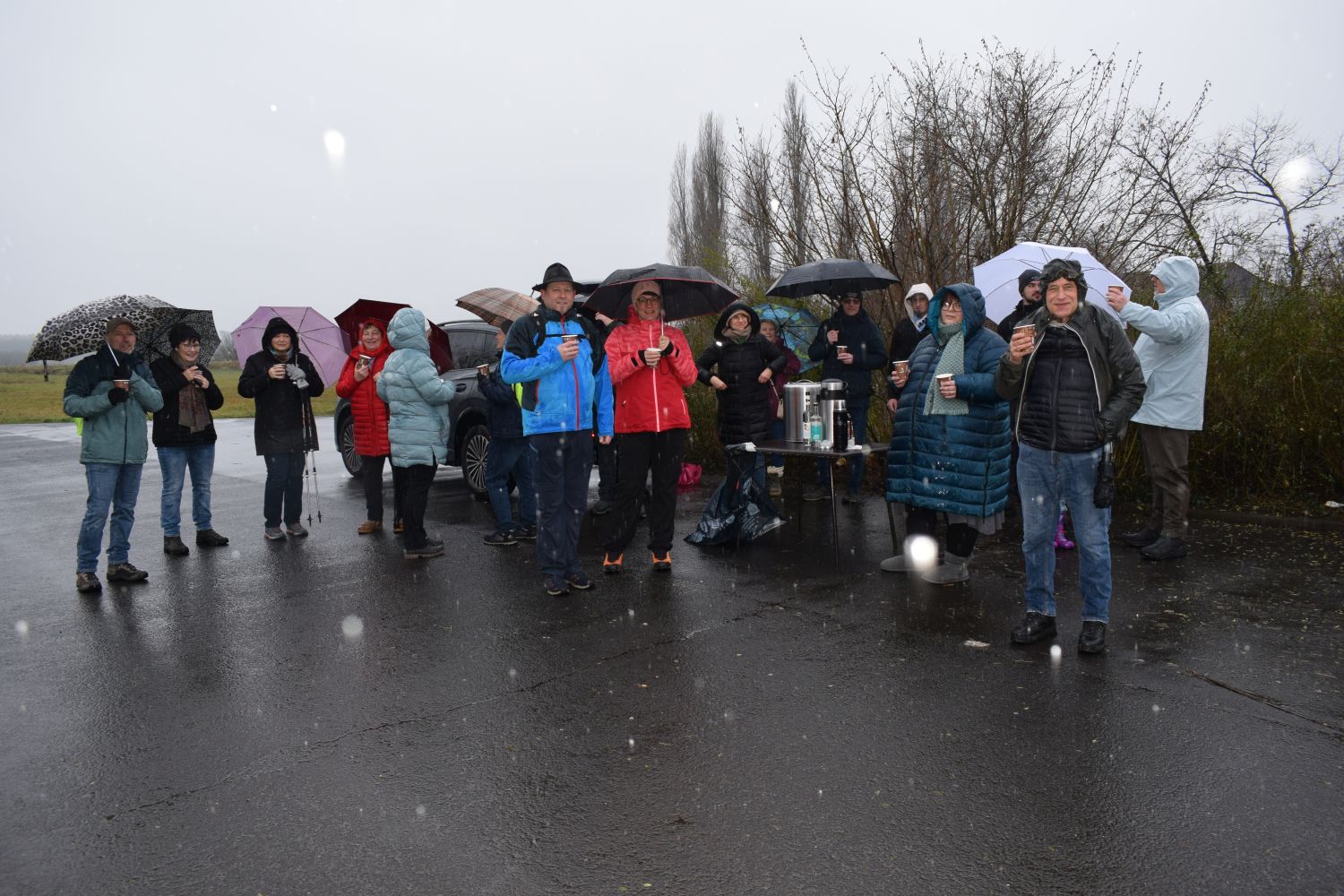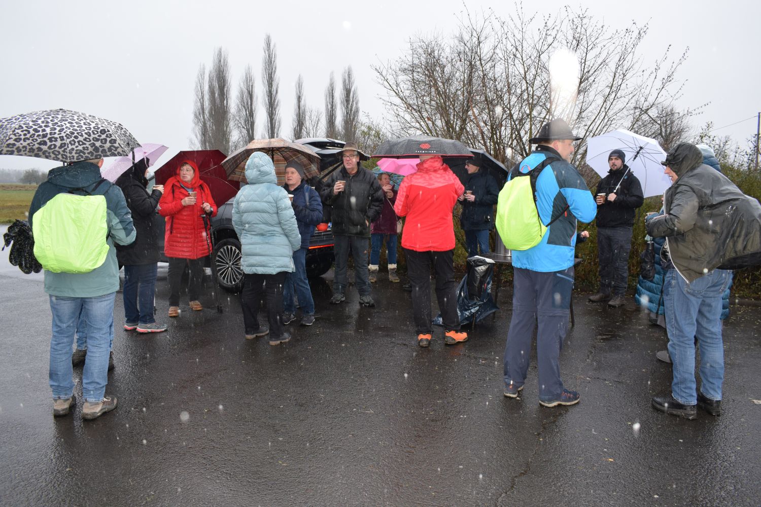 Kenner der jährlich-traditionellen Wanderung wissen, dass es am Zwischenstopp immer etwas Leckeres gibt, bei so (nass-)kaltem Wetter für Leib und Seele Erwärmendes. Nämlich Glühwein, alkoholfreien Punsch und hervorragende Plätzchen. Auch ein Schnäpschen durften sich die Wandernden gönnen. Schön war’s an der Verpflegungsoase und wenn die warme Stube im Wirtshaus nicht gelockt hätte, hätten wir wahrscheinlich am Zwischenhalt Wurzeln geschlagen. Gestärkt und aufgewärmt ging es an der „Forelle“ vorbei und danach Richtung Schloss Emmerichshofen, noch ein kleines Stück entlang der Straße. Nach dem sicheren Überqueren freuten wir uns auf die „gut‘ Stubb‘“ des Wirtshauses am See. Freundlich empfangen und lecker verköstigt wurden wir dort, haben uns prima unterhalten, dann nach etwa zweieinhalb Stunden schön aufgewärmt das Lokal wieder verlassen. Auf neuen Pfaden wanderten wir gen Hörstein. Mit einem weiteren Zwischenstopp auf der Wegstrecke, die bei anbrechender Dunkelheit, Schneefall und zunehmender Kälte rutschiger und glatter wurde. Gottseidank kamen alle Wanderer wohlbehalten an ihr Ziel in Hörstein.