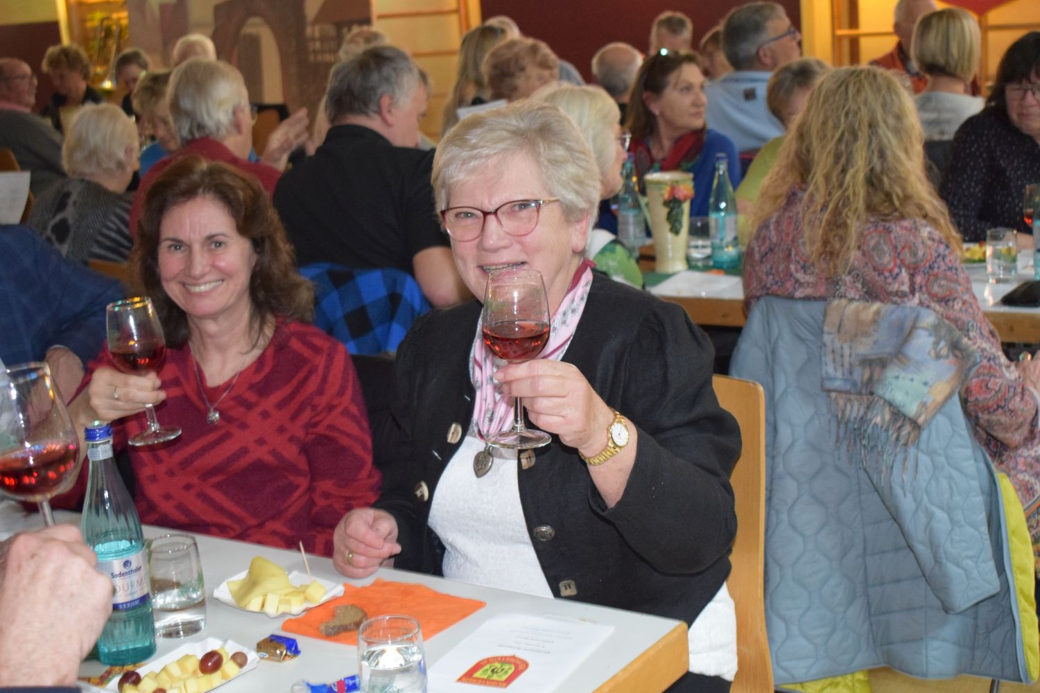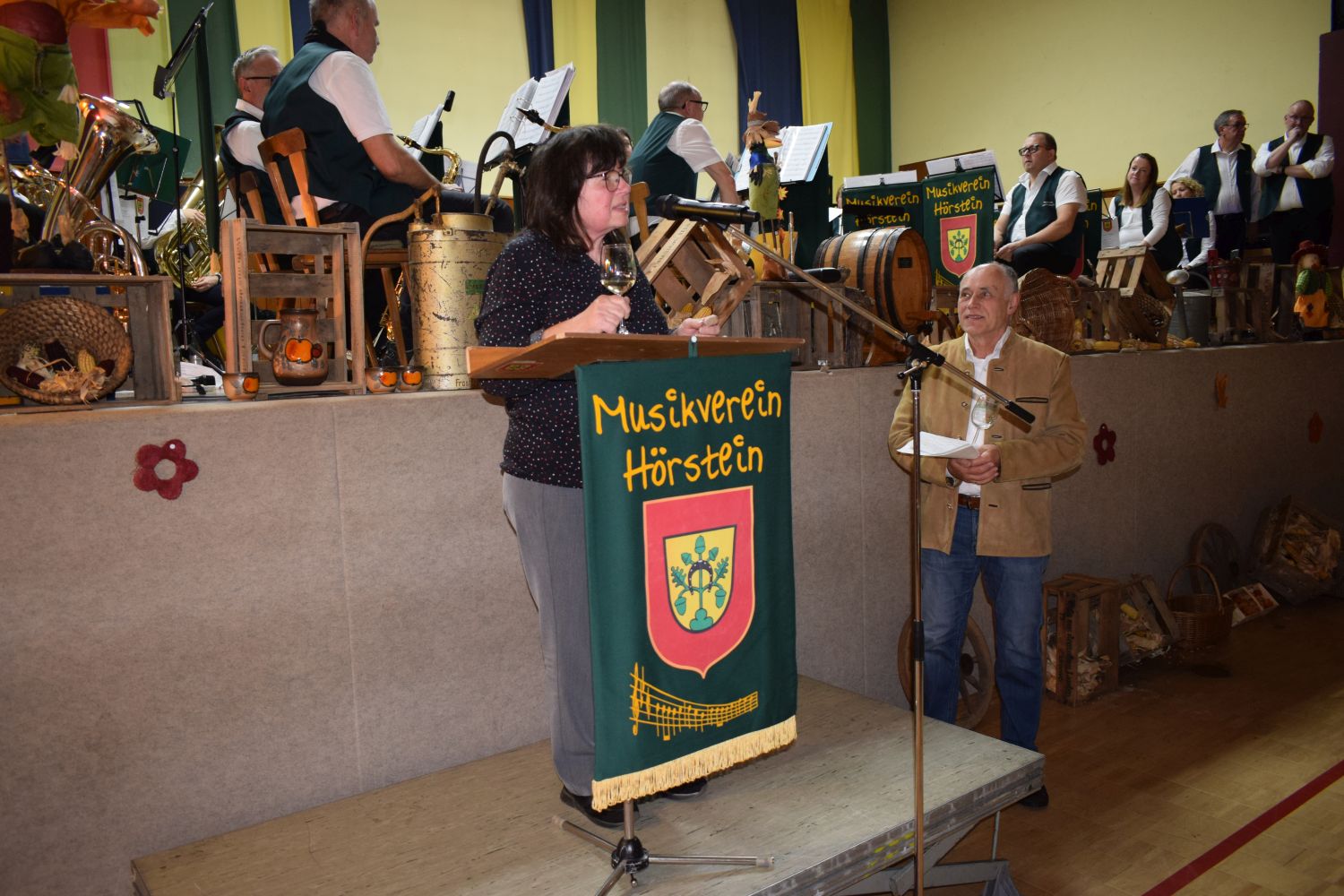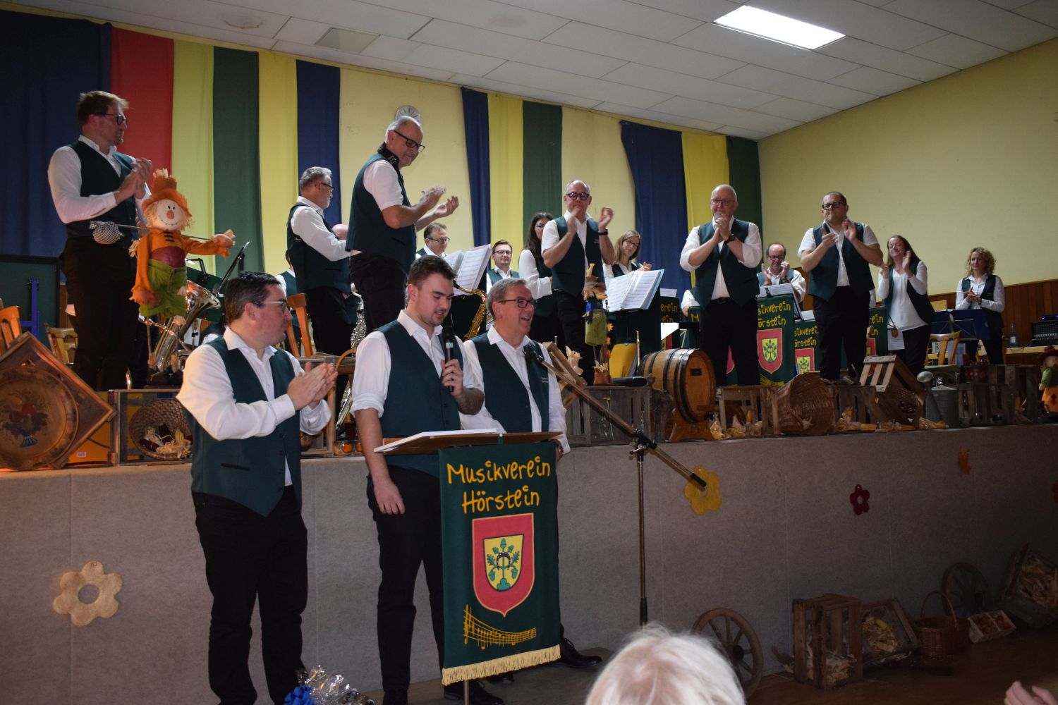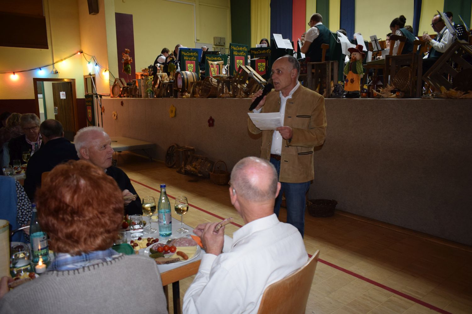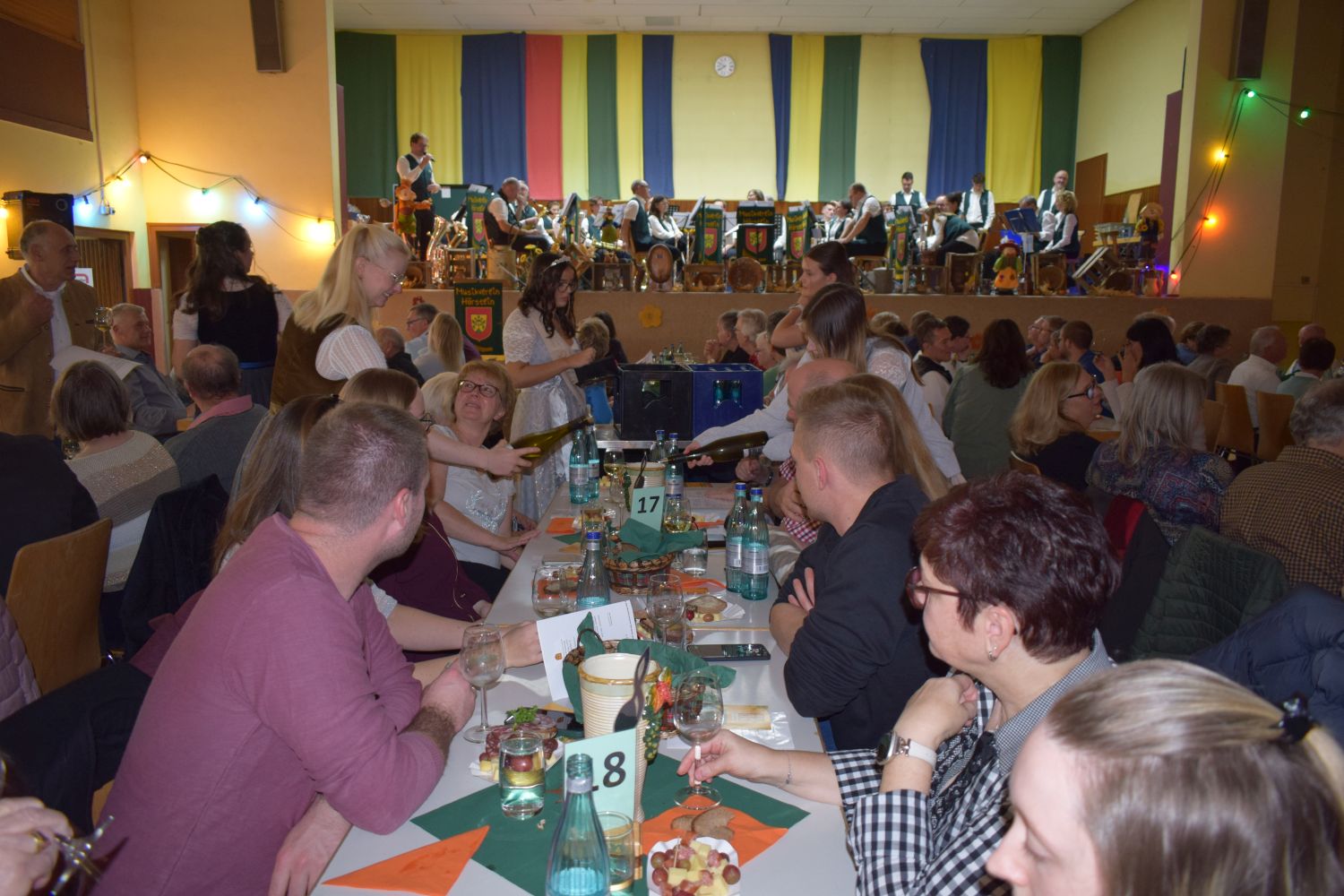 Deutlich mehr als die zugelassenen 168 Plätze hätte der Musikverein Hörstein bei seiner Weinprobe mit Musik in diesem Jahr vergeben können. Die Veranstaltung mit der einzigartigen Kombination aus Weinvorstellung, Weinverkostung, Witz und Musik ist längst eine Institution in Hörstein und hat sich weit über die Ortsgrenzen hinaus herumgesprochen. Erneut gab es 8 Weine zu verkosten, drei aus Hörstein, zwei aus Wasserlos, einen aus Michelbach, eine vom staatlichen Hofkeller Würzburg und einen traditionell vom befreundeten Rheingauer Weingut, das der Veranstaltung wie manch lokaler Winzer seit Anbeginn 2008 die Treue hält. Beschwingt musizierte die Kapelle zum Vesperteller und Schoppenwein, ehe die eigentliche Weinprobe begann. Neben den bekannten und bewährten Rebsorten wie Müller-Thurgau und Riesling, standen auch etwas seltener kredenzte Weine wie Scheurebe und Schwarzriesling auf der Agenda, dazu ein „Mystique Blanc“ der örtlichen Winzergenossen. Die meisten Weine wurden von den Winzern selbst oder Vertreterinnen vorgestellt, ansonsten von Moderator Thomas Heilos, der wie er verriet, durch diese „Aufgabe“ erst in den letzten Jahren seine Liebe zu deutschen Weinen entdeckt hat. Unverzichtbar für die Veranstaltung war erneut Rainer Witthaut: Der Mann für die Vorstellung der Musikstücke, Anekdoten ganz knapp oberhalb der Gürtellinie und Trinksprüche schaffte es erneut, auch bei steigender Ausgelassenheit und Redefreude im Publikum immer wieder für die notwendige Aufmerksamkeit zu sorgen.