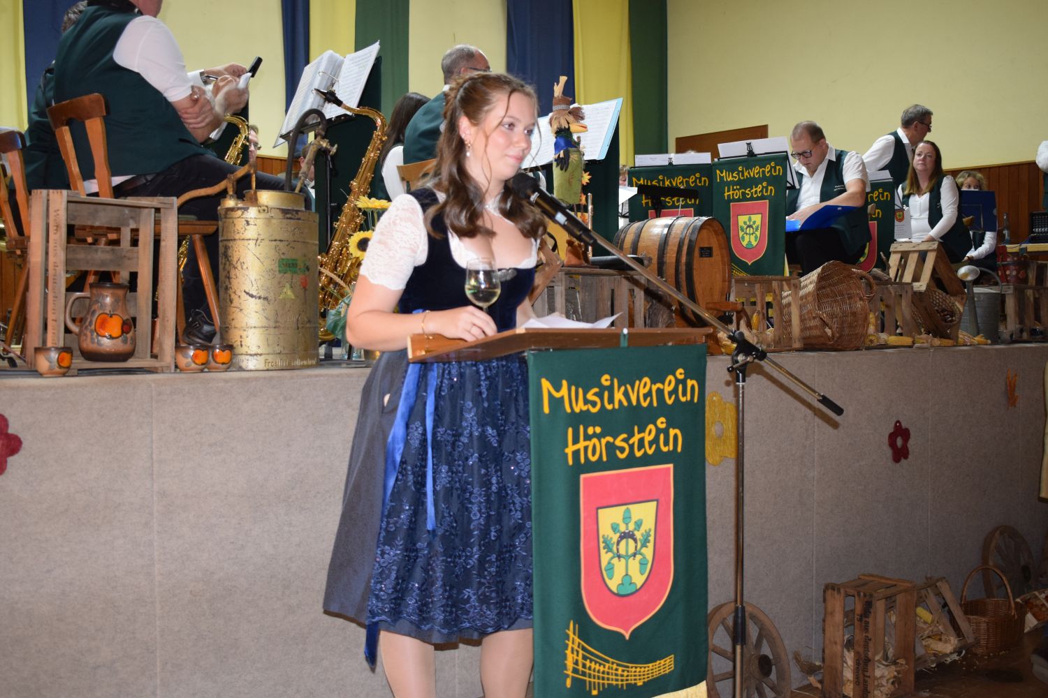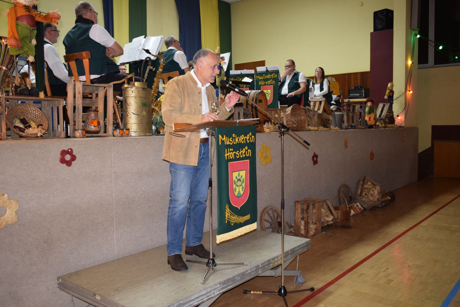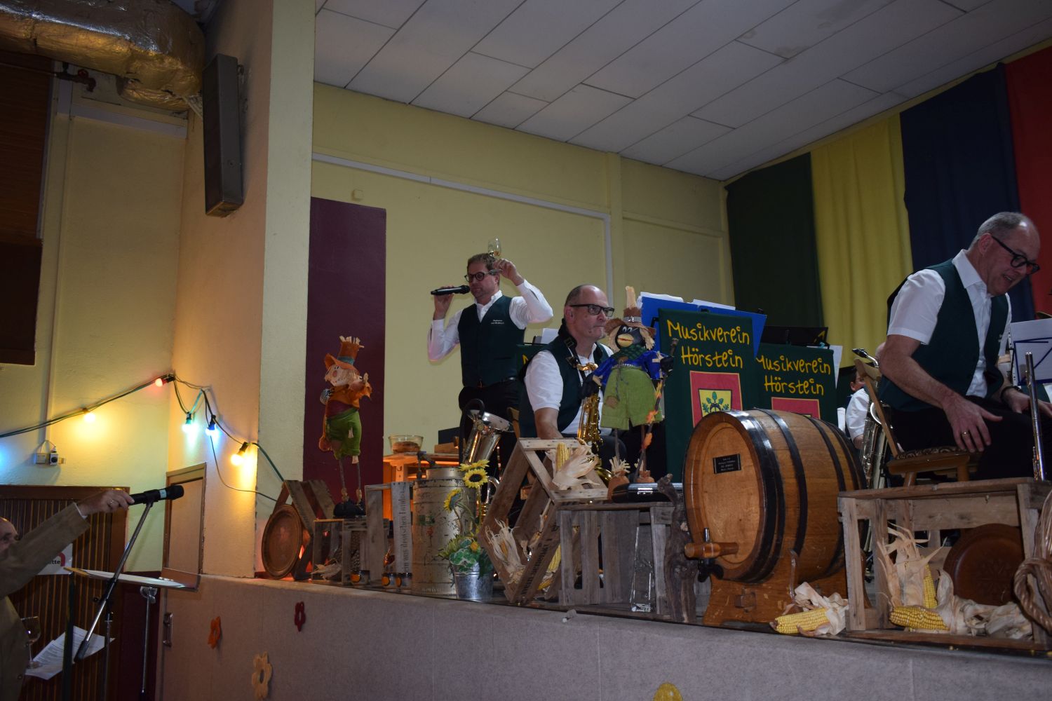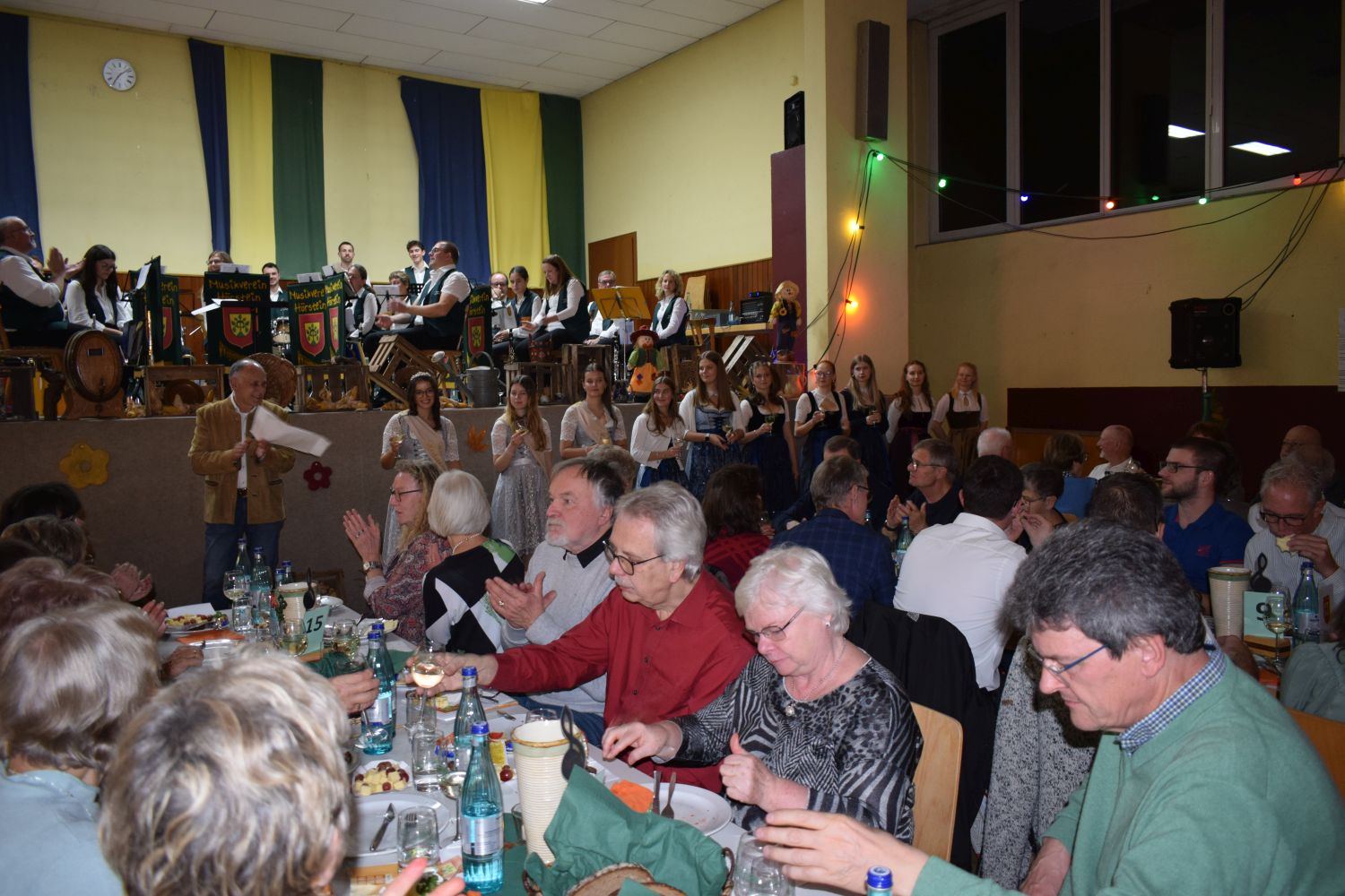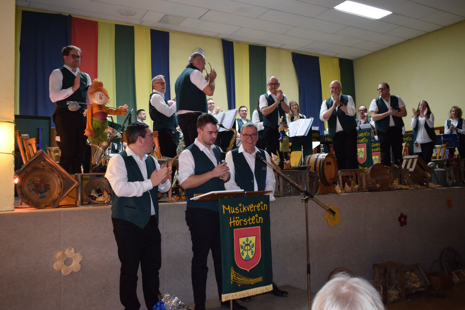 Deutlich mehr als die zugelassenen 168 Plätze hätte der Musikverein Hörstein bei seiner Weinprobe mit Musik in diesem Jahr vergeben können. Die Veranstaltung mit der einzigartigen Kombination aus Weinvorstellung, Weinverkostung, Witz und Musik ist längst eine Institution in Hörstein und hat sich weit über die Ortsgrenzen hinaus herumgesprochen. Erneut gab es 8 Weine zu verkosten, drei aus Hörstein, zwei aus Wasserlos, einen aus Michelbach, eine vom staatlichen Hofkeller Würzburg und einen traditionell vom befreundeten Rheingauer Weingut, das der Veranstaltung wie manch lokaler Winzer seit Anbeginn 2008 die Treue hält. Beschwingt musizierte die Kapelle zum Vesperteller und Schoppenwein, ehe die eigentliche Weinprobe begann. Neben den bekannten und bewährten Rebsorten wie Müller-Thurgau und Riesling, standen auch etwas seltener kredenzte Weine wie Scheurebe und Schwarzriesling auf der Agenda, dazu ein „Mystique Blanc“ der örtlichen Winzergenossen. Die meisten Weine wurden von den Winzern selbst oder Vertreterinnen vorgestellt, ansonsten von Moderator Thomas Heilos, der wie er verriet, durch diese „Aufgabe“ erst in den letzten Jahren seine Liebe zu deutschen Weinen entdeckt hat. Unverzichtbar für die Veranstaltung war erneut Rainer Witthaut: Der Mann für die Vorstellung der Musikstücke, Anekdoten ganz knapp oberhalb der Gürtellinie und Trinksprüche schaffte es erneut, auch bei steigender Ausgelassenheit und Redefreude im Publikum immer wieder für die notwendige Aufmerksamkeit zu sorgen.