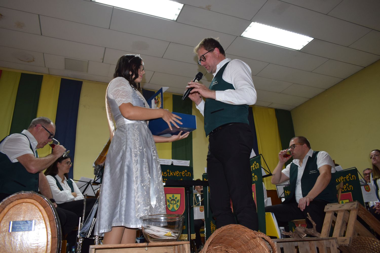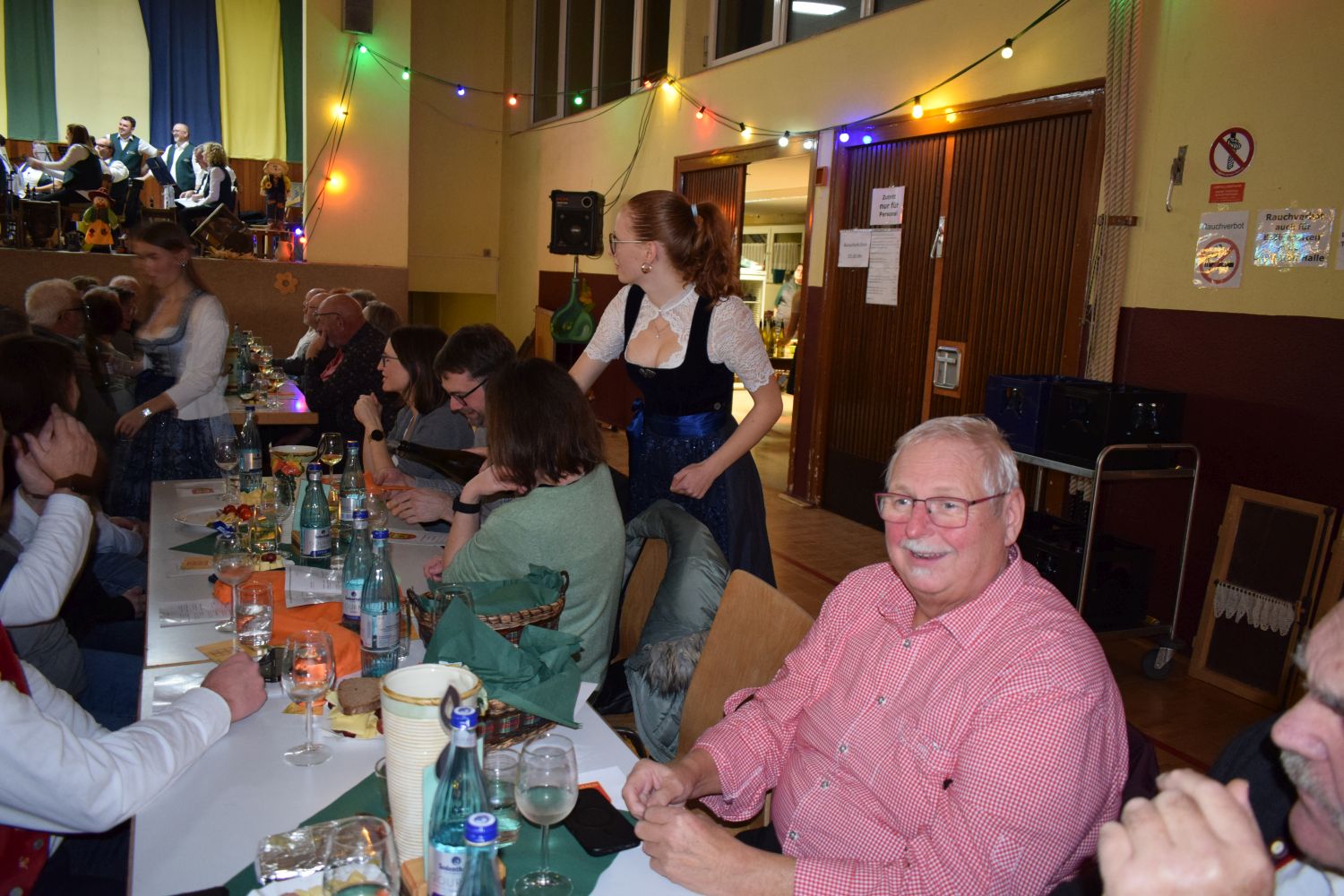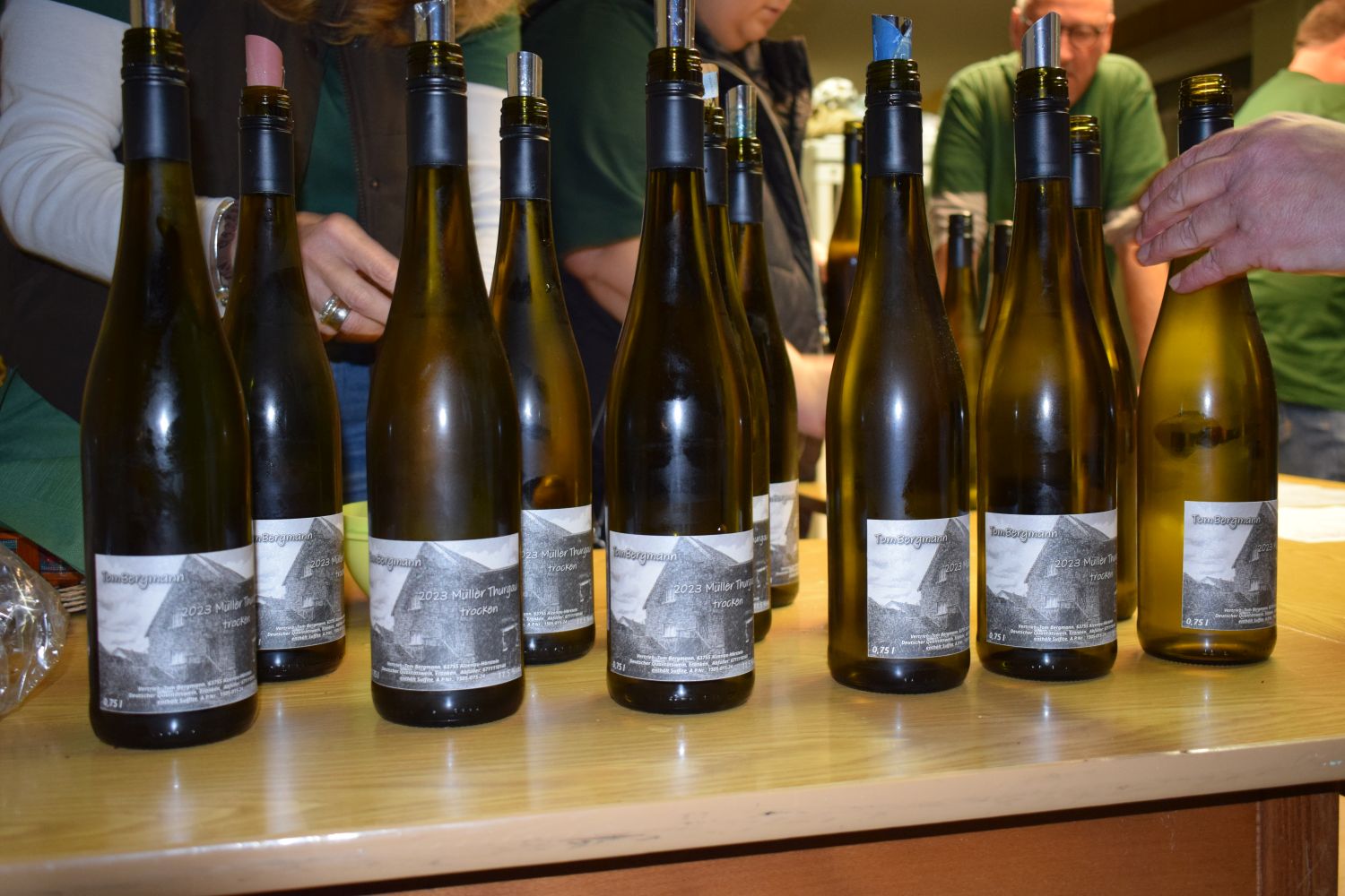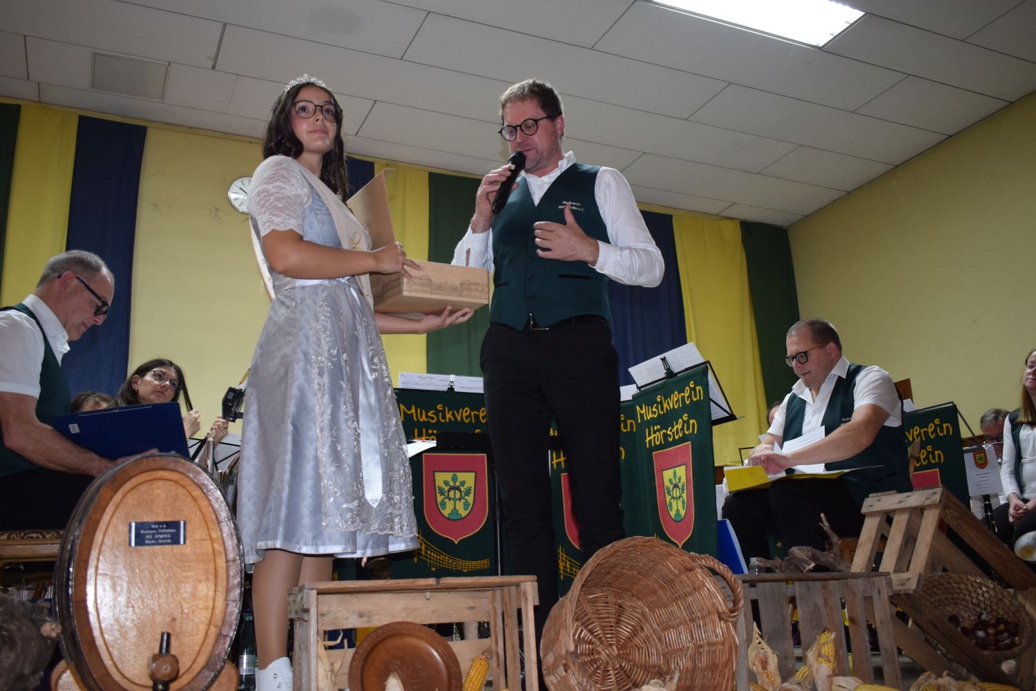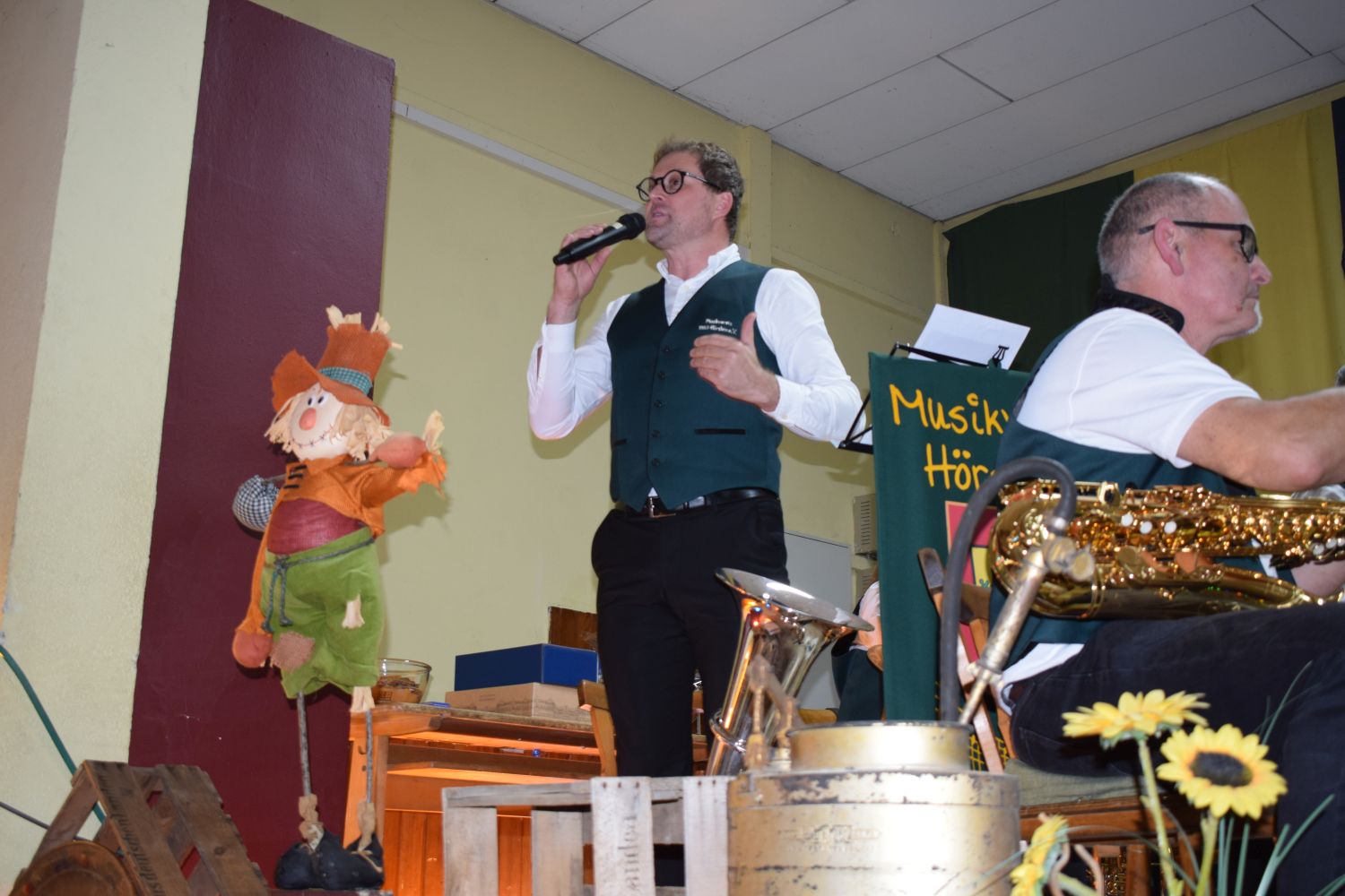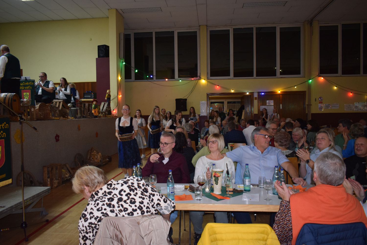 Deutlich mehr als die zugelassenen 168 Plätze hätte der Musikverein Hörstein bei seiner Weinprobe mit Musik in diesem Jahr vergeben können. Die Veranstaltung mit der einzigartigen Kombination aus Weinvorstellung, Weinverkostung, Witz und Musik ist längst eine Institution in Hörstein und hat sich weit über die Ortsgrenzen hinaus herumgesprochen. Erneut gab es 8 Weine zu verkosten, drei aus Hörstein, zwei aus Wasserlos, einen aus Michelbach, eine vom staatlichen Hofkeller Würzburg und einen traditionell vom befreundeten Rheingauer Weingut, das der Veranstaltung wie manch lokaler Winzer seit Anbeginn 2008 die Treue hält. Beschwingt musizierte die Kapelle zum Vesperteller und Schoppenwein, ehe die eigentliche Weinprobe begann. Neben den bekannten und bewährten Rebsorten wie Müller-Thurgau und Riesling, standen auch etwas seltener kredenzte Weine wie Scheurebe und Schwarzriesling auf der Agenda, dazu ein „Mystique Blanc“ der örtlichen Winzergenossen. Die meisten Weine wurden von den Winzern selbst oder Vertreterinnen vorgestellt, ansonsten von Moderator Thomas Heilos, der wie er verriet, durch diese „Aufgabe“ erst in den letzten Jahren seine Liebe zu deutschen Weinen entdeckt hat. Unverzichtbar für die Veranstaltung war erneut Rainer Witthaut: Der Mann für die Vorstellung der Musikstücke, Anekdoten ganz knapp oberhalb der Gürtellinie und Trinksprüche schaffte es erneut, auch bei steigender Ausgelassenheit und Redefreude im Publikum immer wieder für die notwendige Aufmerksamkeit zu sorgen.