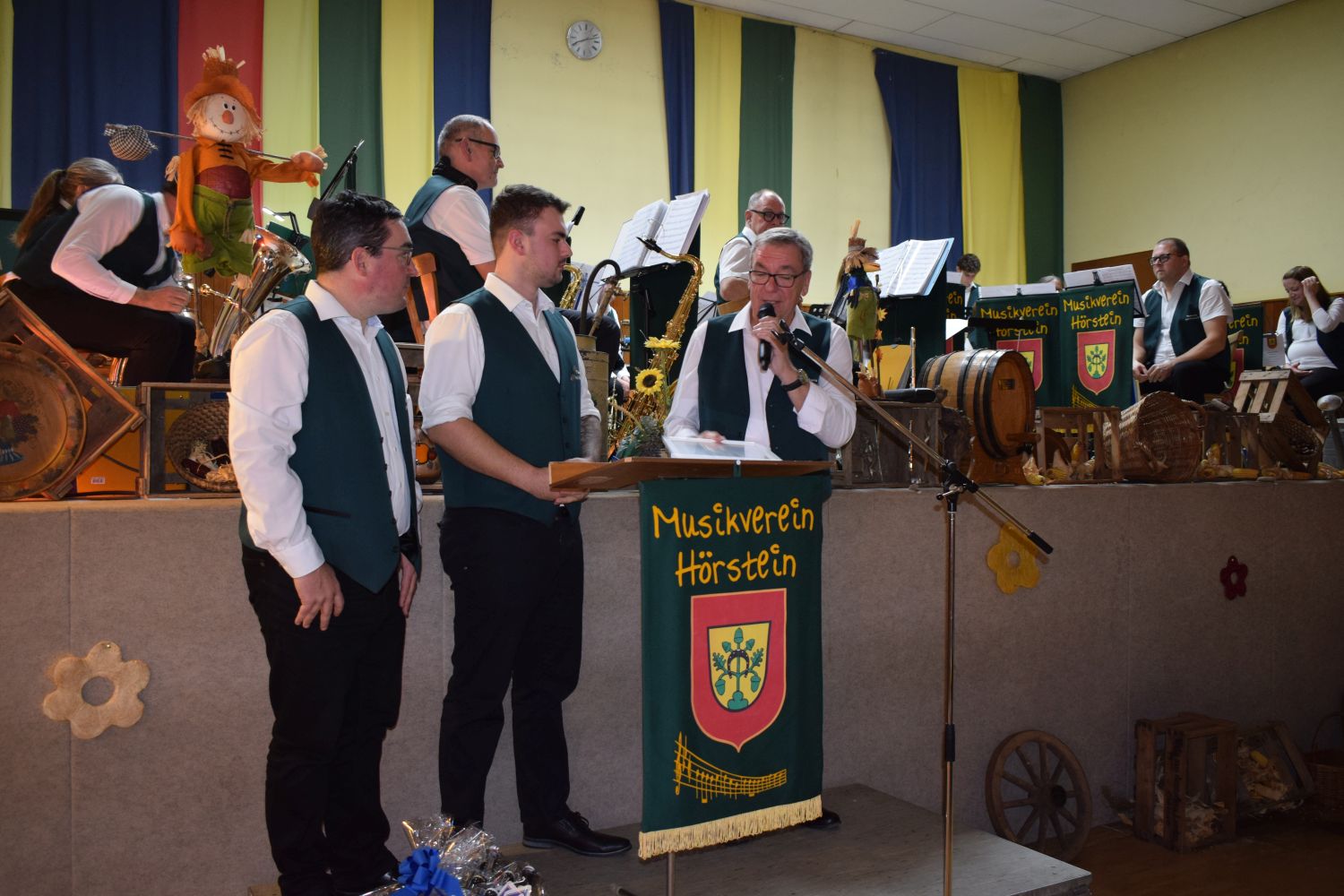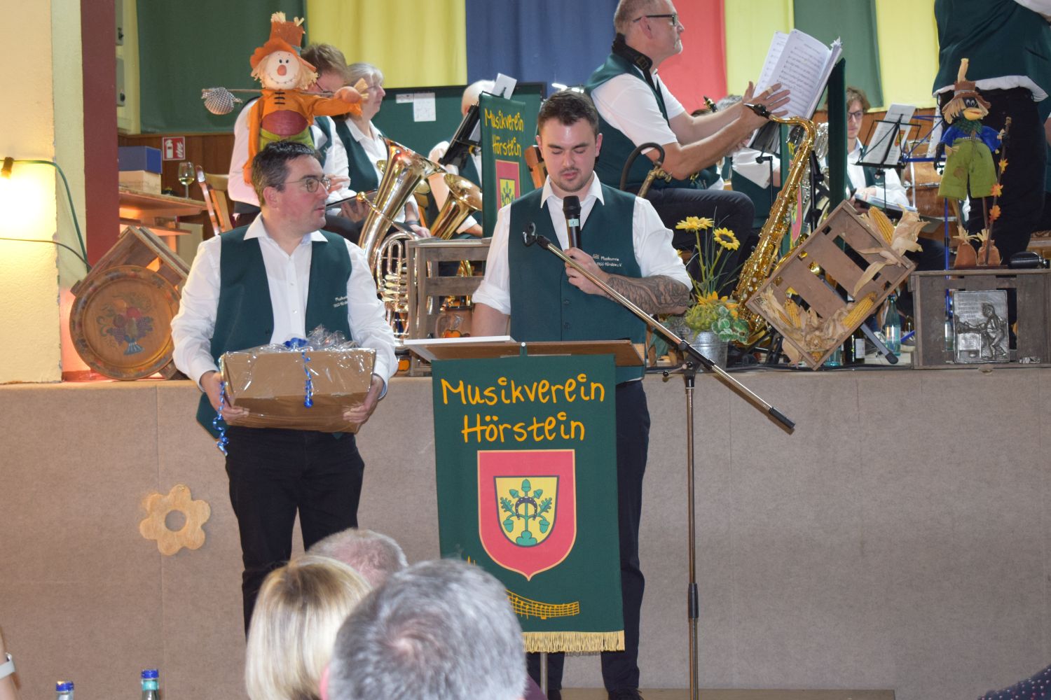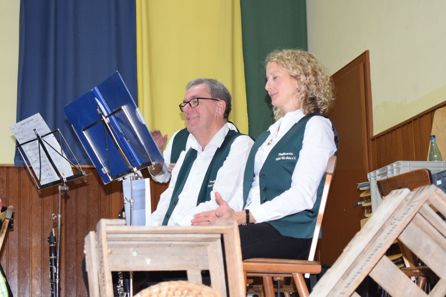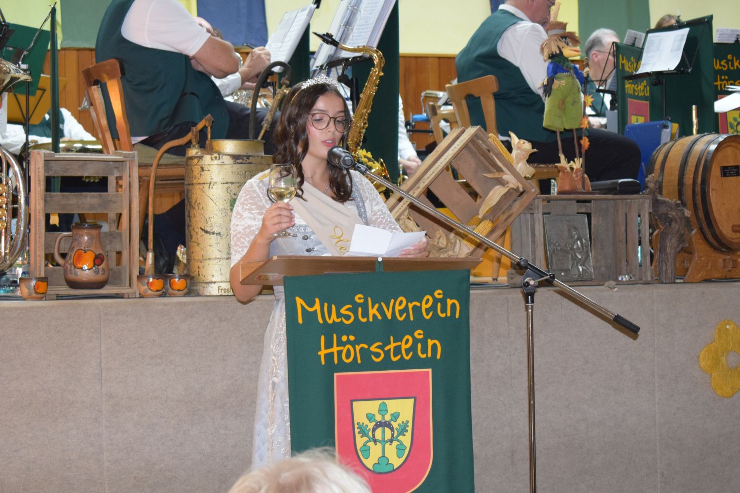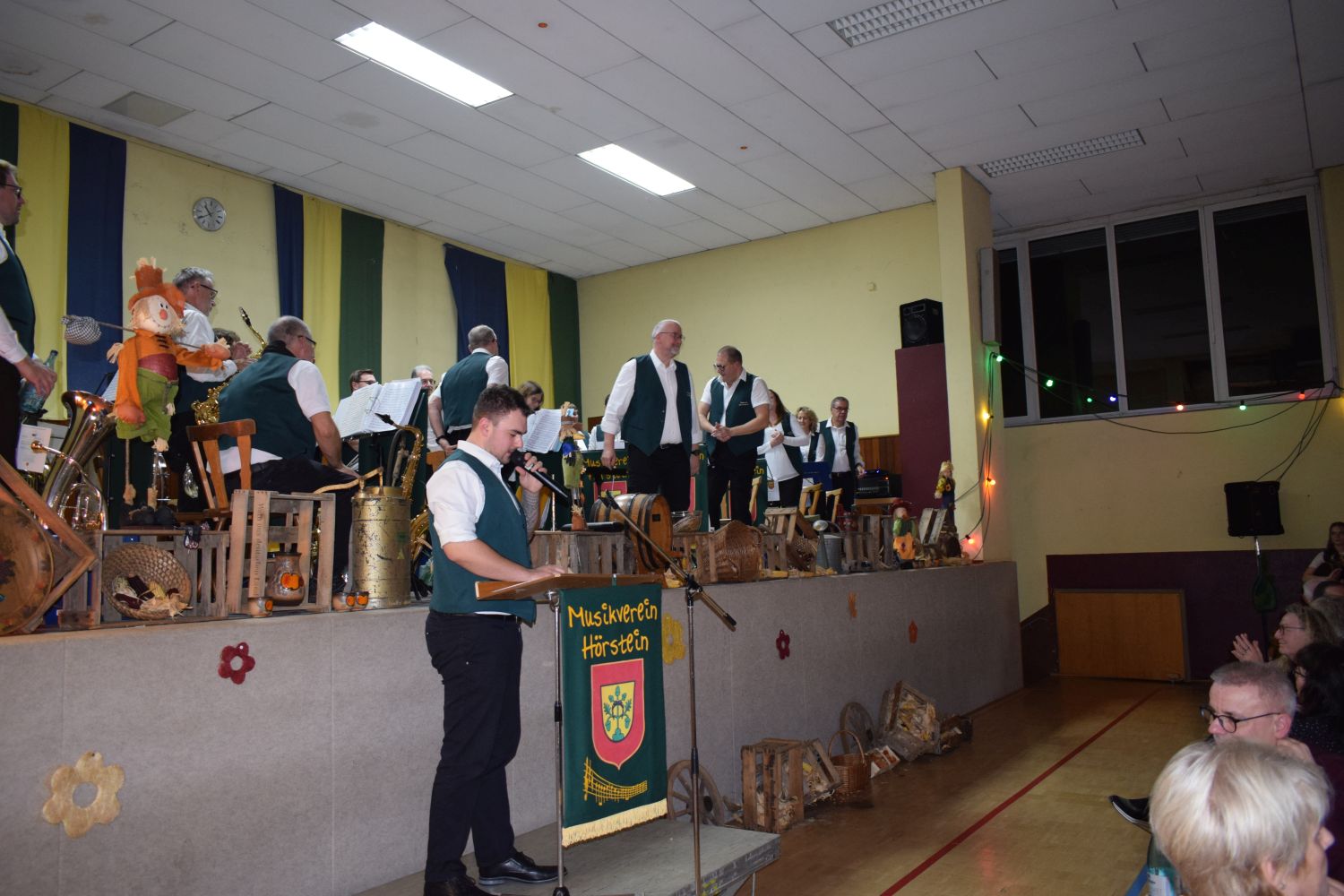 Deutlich mehr als die zugelassenen 168 Plätze hätte der Musikverein Hörstein bei seiner Weinprobe mit Musik in diesem Jahr vergeben können. Die Veranstaltung mit der einzigartigen Kombination aus Weinvorstellung, Weinverkostung, Witz und Musik ist längst eine Institution in Hörstein und hat sich weit über die Ortsgrenzen hinaus herumgesprochen. Erneut gab es 8 Weine zu verkosten, drei aus Hörstein, zwei aus Wasserlos, einen aus Michelbach, eine vom staatlichen Hofkeller Würzburg und einen traditionell vom befreundeten Rheingauer Weingut, das der Veranstaltung wie manch lokaler Winzer seit Anbeginn 2008 die Treue hält. Beschwingt musizierte die Kapelle zum Vesperteller und Schoppenwein, ehe die eigentliche Weinprobe begann. Neben den bekannten und bewährten Rebsorten wie Müller-Thurgau und Riesling, standen auch etwas seltener kredenzte Weine wie Scheurebe und Schwarzriesling auf der Agenda, dazu ein „Mystique Blanc“ der örtlichen Winzergenossen. Die meisten Weine wurden von den Winzern selbst oder Vertreterinnen vorgestellt, ansonsten von Moderator Thomas Heilos, der wie er verriet, durch diese „Aufgabe“ erst in den letzten Jahren seine Liebe zu deutschen Weinen entdeckt hat. Unverzichtbar für die Veranstaltung war erneut Rainer Witthaut: Der Mann für die Vorstellung der Musikstücke, Anekdoten ganz knapp oberhalb der Gürtellinie und Trinksprüche schaffte es erneut, auch bei steigender Ausgelassenheit und Redefreude im Publikum immer wieder für die notwendige Aufmerksamkeit zu sorgen.