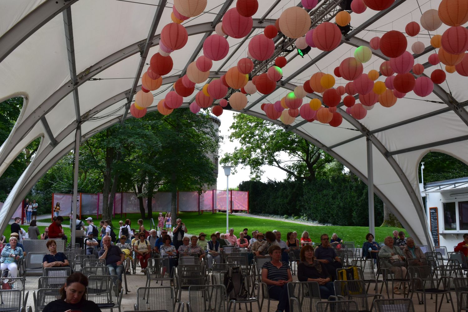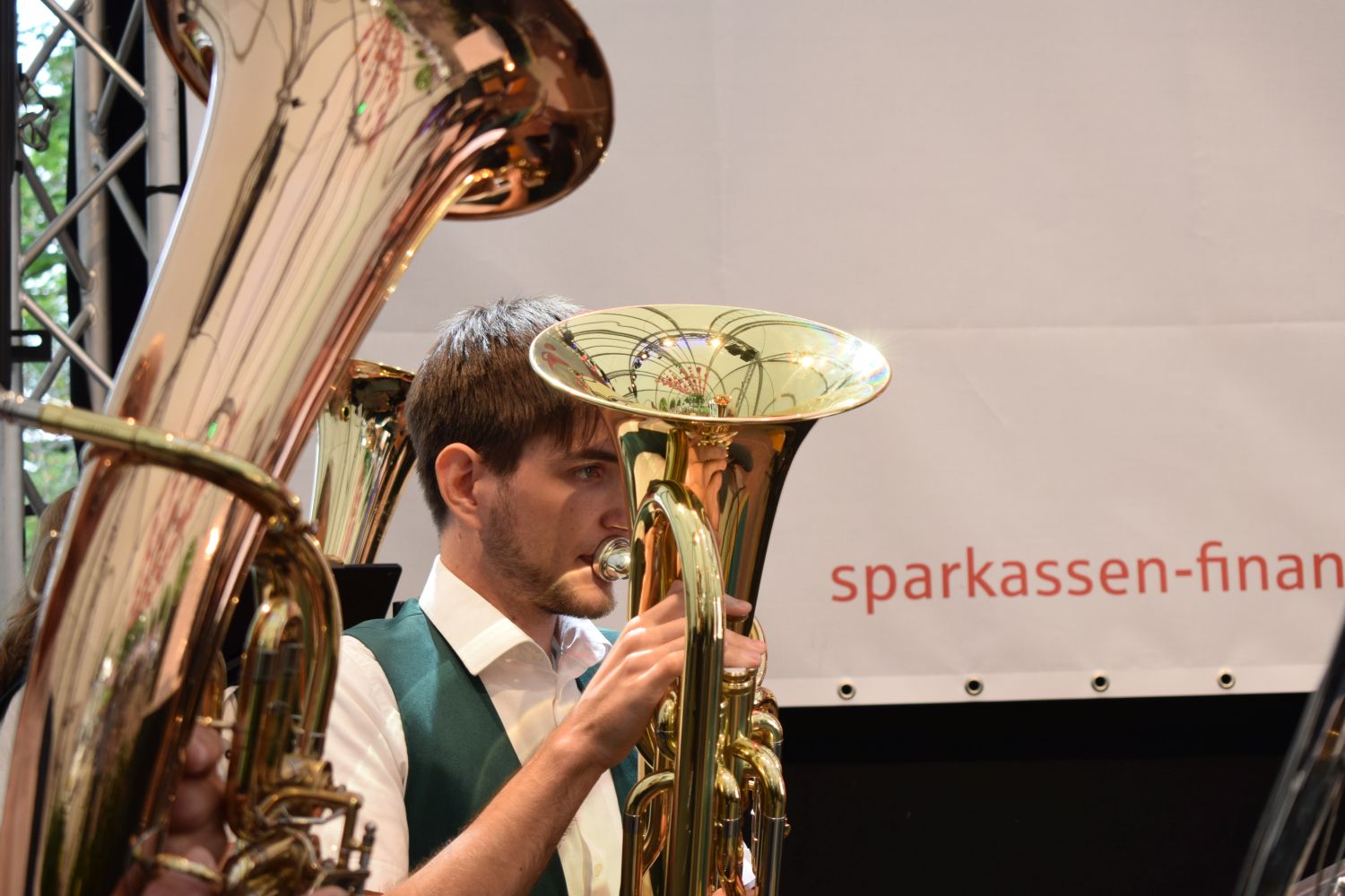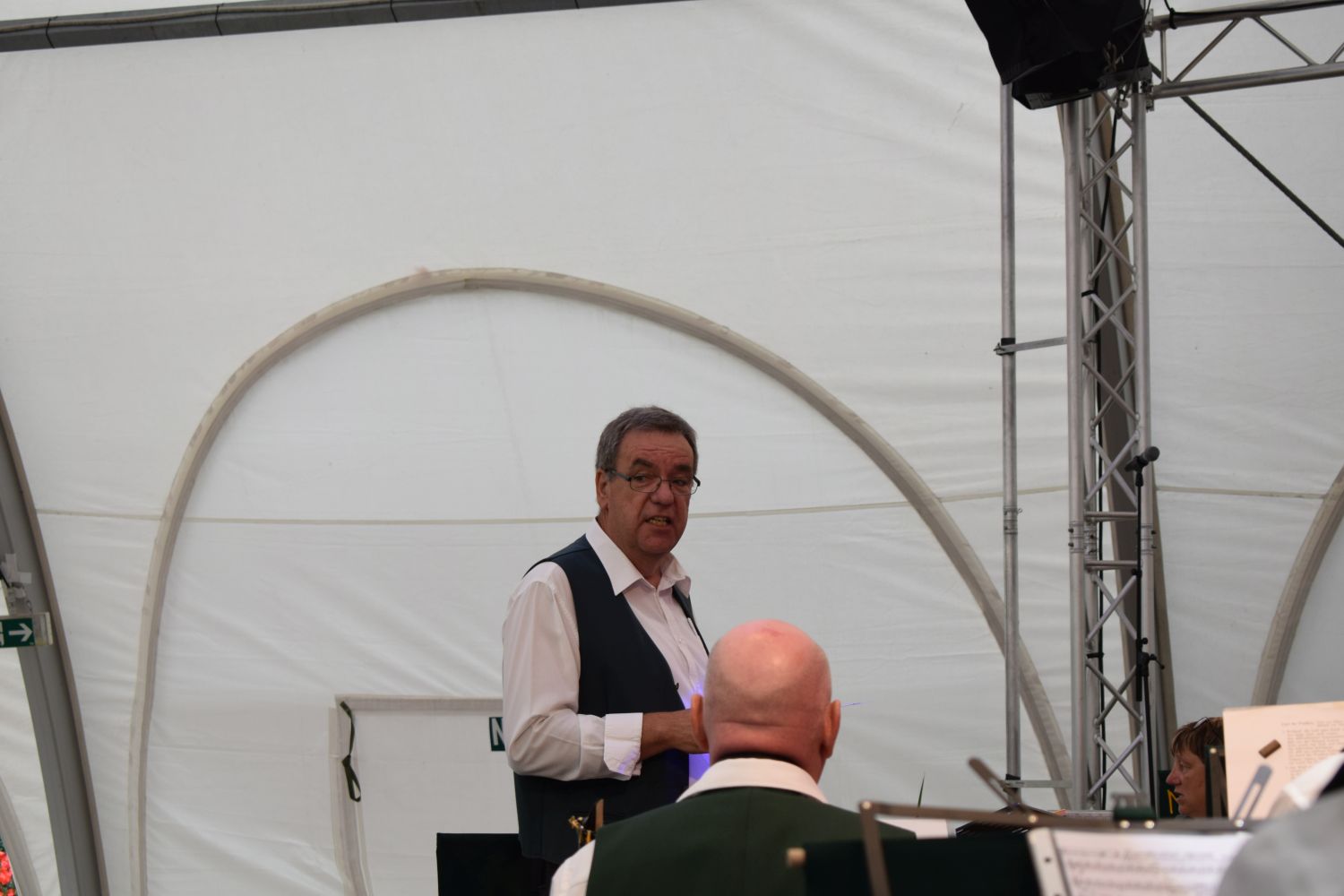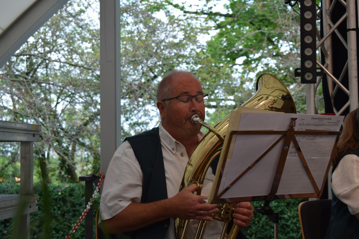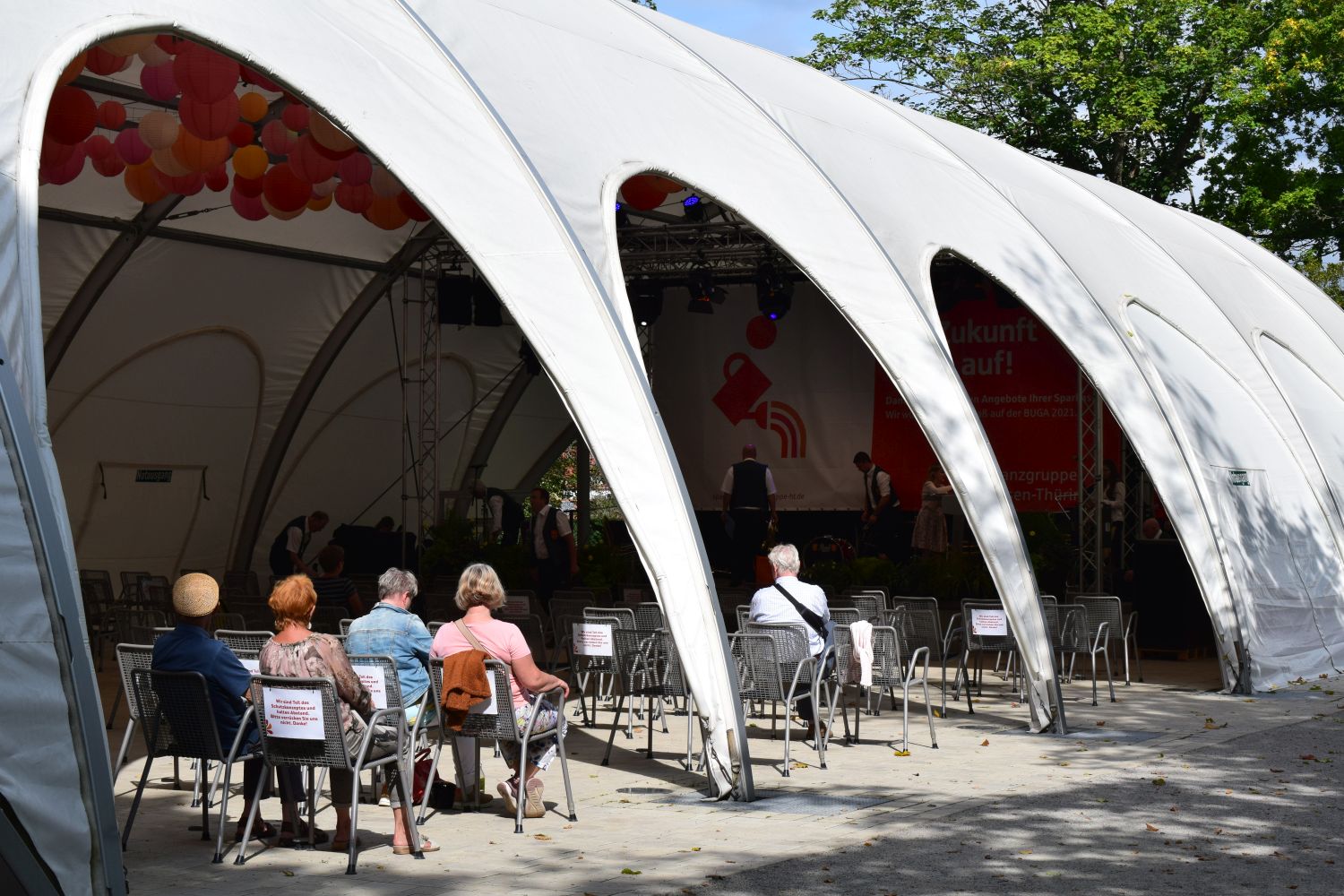 Vom Frühstück gut gestärkt machte sich der Tross dann am Sonntagvormittag auf in Richtung Bundegartenschau, wo um 12:00 Uhr die Bühne im egapark auf uns wartete: „Ein musikalischer Brückenschlag von Unterfranken nach Thüringen“ war das Motto unseres einstündigen Konzertes und so war der Auftakt mit dem „Frankenlied Marsch“ inklusive Gesangseinlage quasi vorgegeben.