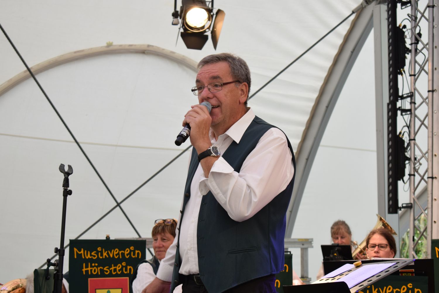 Aber just für das Konzert wurde es kurzzeitig besser und so hatte man das ergreifende Erlebnis, zusammen mit sieben anderen Kapellen mehrere Stücke zu intonieren, wobei Prof. Johann Österreicher sein von ihm geschriebenes Stück selbst dirigierte. Kaum war der letzte Ton verklungen setzte erneut sintflutartiger Regen ein. Glück gehabt! Am späteren Nachmittag wurden die Hörsteiner Musikerinnen und Musiker dann ungeplant für ein 30minütiges Spontankonzert auf die Bühne gebeten. Zwei Musiker hatten sich unglücklicherweise in die örtlichen Weinberge verirrt, aber zwei Pfaffstättener Musiker sprangen ein und beim zweiten Stück waren dann auch die beiden „verlorenen Söhne“ am Arbeitsplatz und halfen mit, das Festzelt zum Kochen zu bringen.